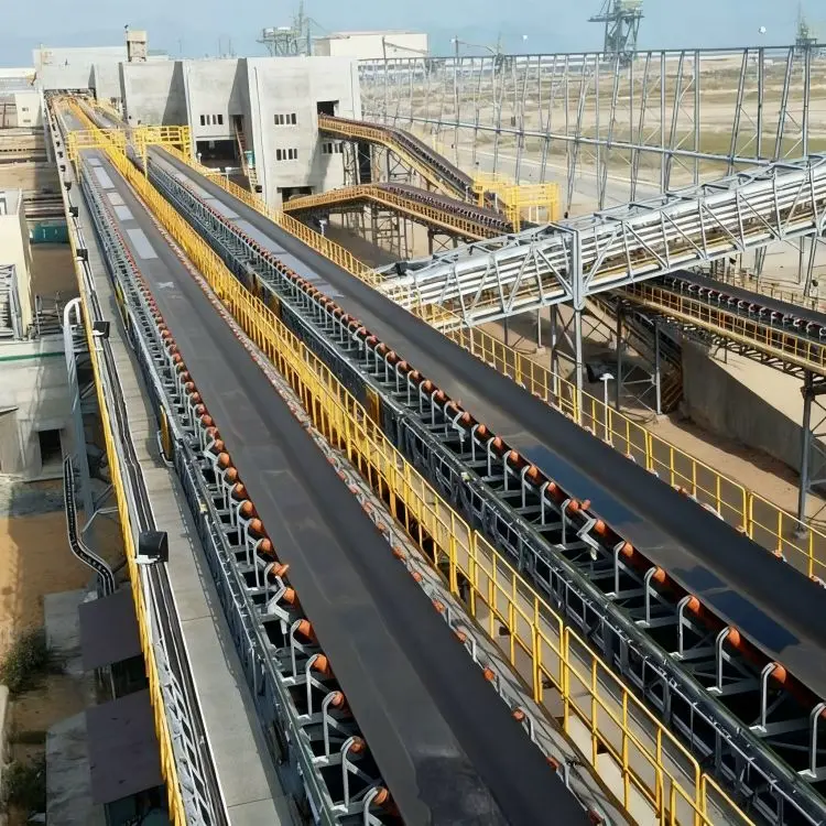 Para las diferentes condiciones de funcionamiento del trayecto de 5.537 metros, se configuran tres tipos de transportadores de correa, todos conformes a los estándares técnicos de ZOOMRY y adaptados a las características de los materiales: el transportador de correa a larga distancia (línea principal) se utiliza en el tramo recto del trayecto de 5.537 metros, con ancho de correa de 1.600mm, capacidad de tratamiento diseñada de 4.200 toneladas por hora y velocidad de correa de 4,0m/s. Adopta un diseño de "sincronización de múltiples unidades de accionamiento" (3 motores de frecuencia variable de 315kW, potencia total de 945kW, nivel de protección IP55), combinado con un reductor de engranajes de diente duro (eficiencia de transmisión ≥96%), garantizando un transporte estable a larga distancia y con carga pesada. Los rodillos son de tipo silencioso (diámetro de 159mm, adaptado al ancho de correa de 1.600mm), con salto radial ≤0,4mm (superior al estándar nacional de 0,5mm) y absorción de agua ≤95g en la prueba de inmersión de 72 horas (superior al estándar de ZOOMRY de 100g), adaptándose a entornos húmedos. La correa es una correa transportadora con núcleo de cable de acero modelo ST2500 (resistencia a la tracción ≥2.500N/mm), con capa resistente a la abrasión de 15mm para hacer frente a la alta abrasión del mineral; su estructura de sellado superpuesto (sobrerealce de 130mm) reduce la emisión de polvo. El transportador de correa de gran inclinación (tramo de pendiente suave) se utiliza en el tramo de pendiente suave de 15°, con ancho de correa de 1.400mm y capacidad de tratamiento de 2.800 toneladas por hora. Adopta un diseño de "conjunto de rodillos en canal (ángulo de canal de 35°) + correa con bordes ondulados"; en comparación con los transportadores de correa ordinarios (máxima inclinación de 12°), puede subir pendientes sin transbordo, acortando el trayecto en 200 metros. Los bordes ondulados de 200mm de altura y las divisiones con espaciado de 1,5m evitan el derrame de mineral y la adherencia del carbón; la unidad de accionamiento está equipada con un dispositivo de tensado hidráulico que compensa automáticamente la dilatación y contracción térmica de la correa, evitando el resbalamiento. El transportador de correa curvo (tramo de curva) se utiliza en 2 curvas de 90°, con ancho de correa de 1.200mm y capacidad de tratamiento de 1.800 toneladas por hora. Adopta "conjunto de rodillos autocompensadores + tecnología de giro flexible", con radio de giro de solo 30m (los transportadores de correa ordinarios requieren ≥80m), sin necesidad de talar árboles o nivelar el terreno. Los rodillos están hechos de material HDPE, con resistencia a la corrosión incrementada en un 40%, adaptándose a la abrasión por polvo durante el transporte de mineral. El sistema de control de tensión de la correa ajusta la tensión en tiempo real, garantizando que no haya desviación durante el funcionamiento en curva.